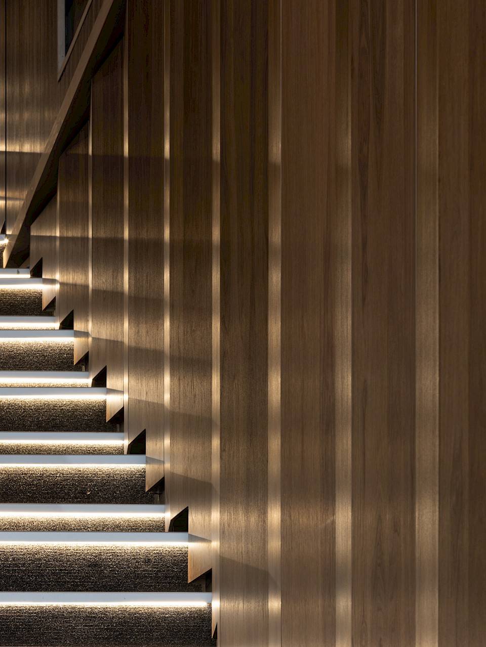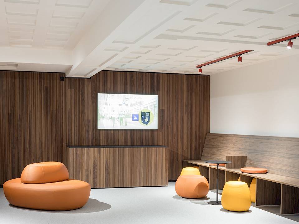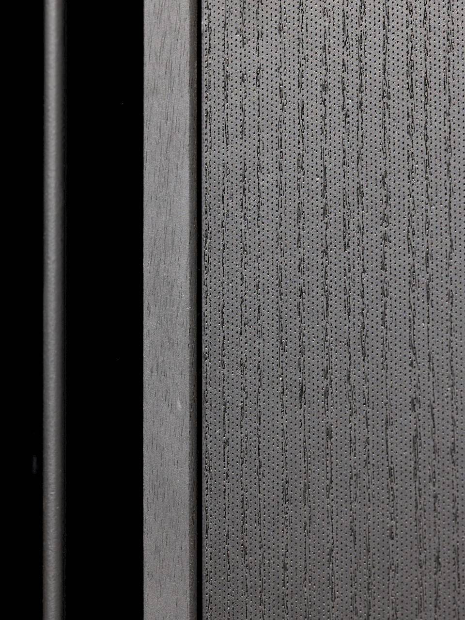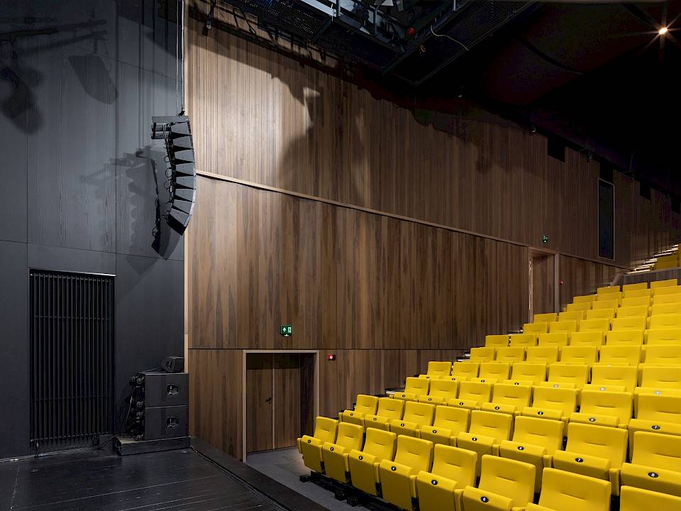 Acoustic engineering firm Daidalos Peutz was called in to determine the acoustic comfort. For the hall, 3 products were combined: black oak veneer walls with nano perforations were provided for the front stage, while in the hall and foyer a combination of grooved Dr panels in warm American walnut veneer on black MDF boards was chosen, combined with solid panels of Am. Walnut. In the hall, part of walls were set under degrees for perfect combination absorption, reflection and diffusion of the hall sound.